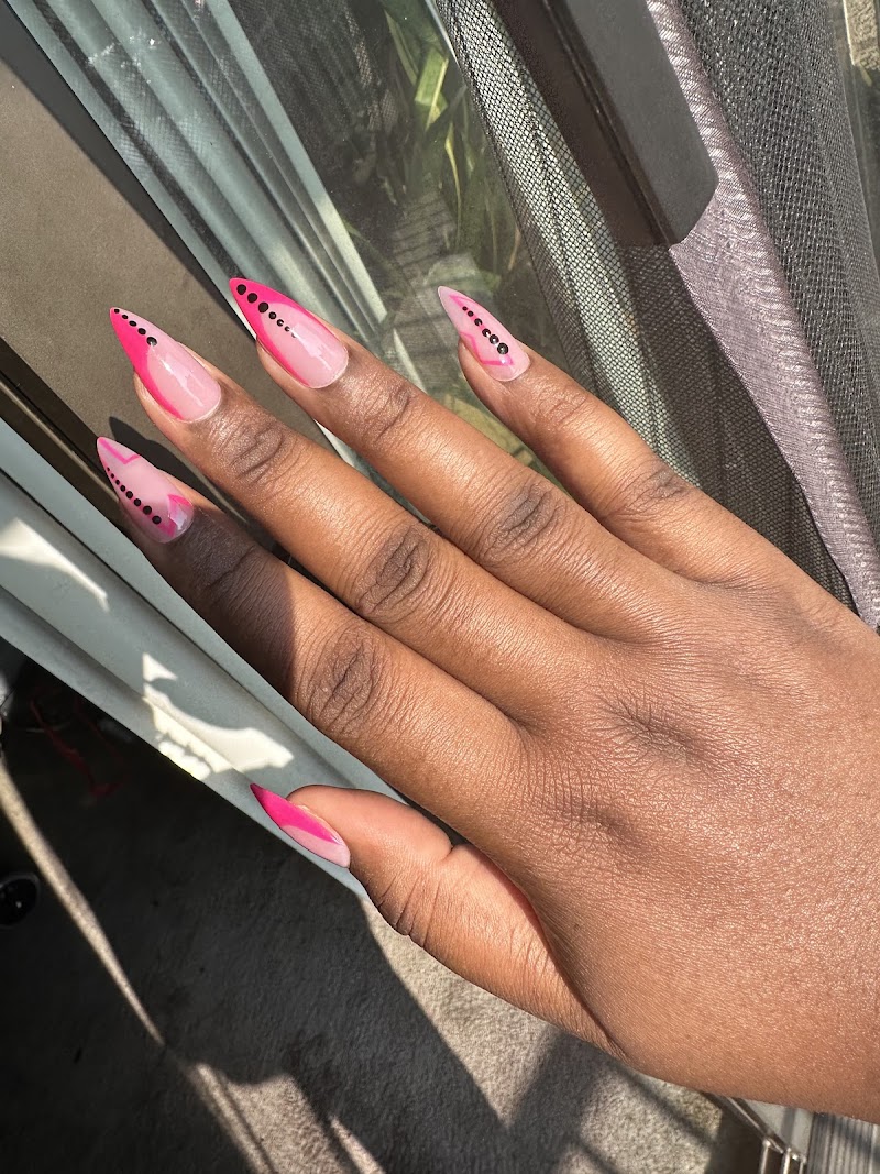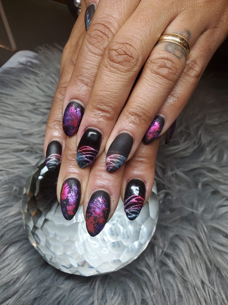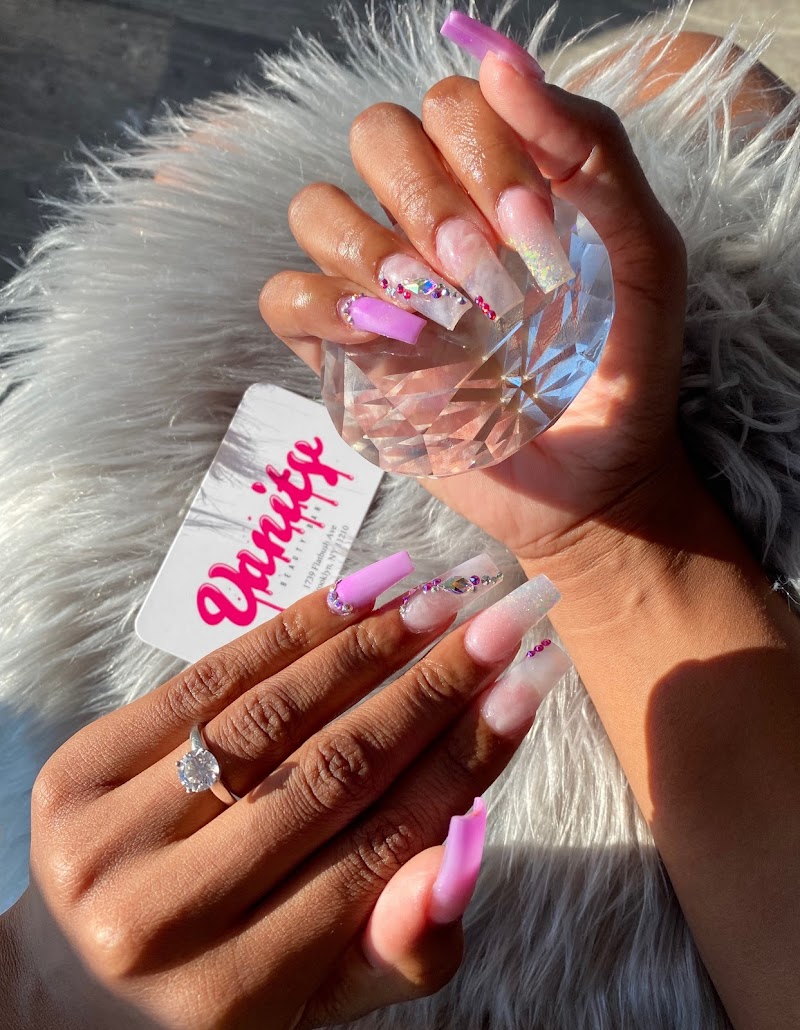 Vanity Beauty Bar is a nail salon in Flatbush, New York, rated 4.5 stars on Google. The salon is known for glitter-gel effects and intricate hand-painted nail art.