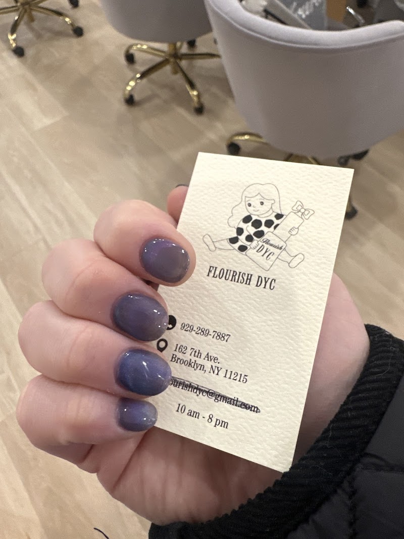 Flourish Dyc Nail SPA & Beauty Facial is a nail salon in Park Slope, New York, rated 4.7 stars on Google. The salon is known for high-shine glossy lacquers and almond-shaped nails.