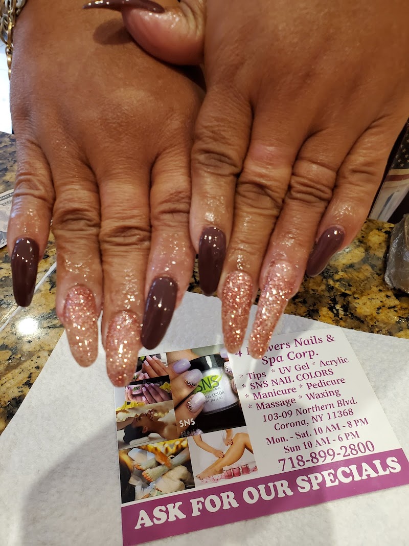 4 Flowers Nails & SPA is a nail salon in Queens, New York, rated 4 stars on Google. The salon is known for high-shine glossy lacquers and intricate hand-painted nail art.