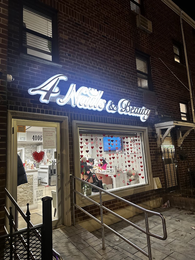 4 Nails & Beauty is a nail salon in Queens, New York, rated 4.4 stars on Google. The salon is known for high-shine glossy lacquers and almond-shaped nails.