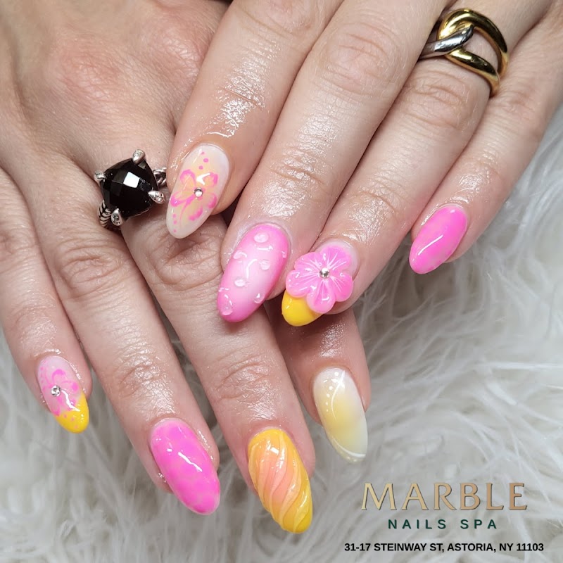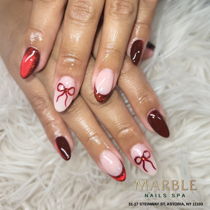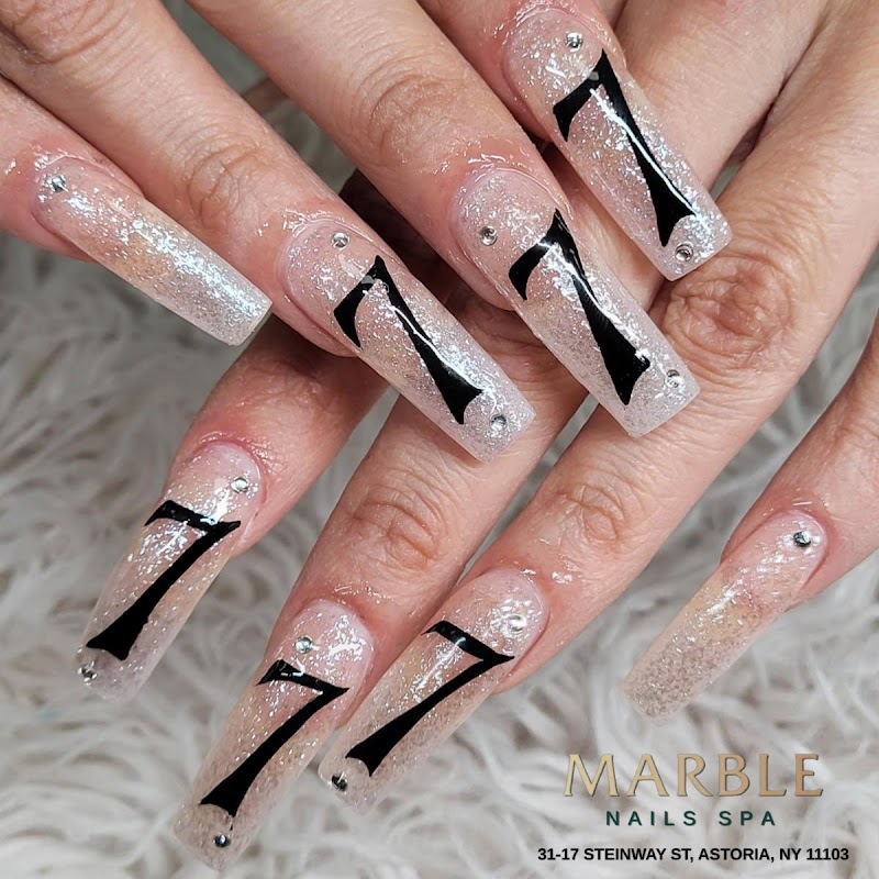Marble Nails SPA is a nail salon in Queens, New York, rated 4.3 stars on Google. The salon is known for high-shine glossy lacquers and intricate hand-painted nail art.